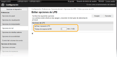 2 | Configure las opciones según sus necesidades. ![]() [Usar impresión LPD] Seleccione la casilla de verificación para imprimir a través de LPD. Cuando no utilice la impresión LPD, quite la marca de la casilla de verificación. [Usar impresión RAW] Seleccione la casilla de verificación para imprimir a través de RAW. Cuando no utilice la impresión RAW, quite la marca de la casilla de verificación. [Tiempo de espera de RX] Establezca un valor como tiempo de espera de reinicio para la recepción de datos. Si la recepción de datos no se reanudara dentro del tiempo establecido, la impresión se cancelará. |