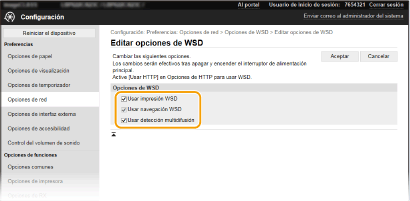 2 | Configure las opciones según sus necesidades. ![]() [Usar impresión WSD] Seleccione la casilla de verificación para imprimir a través de WSD. Cuando no utilice la impresión WSD, quite la marca de la casilla de verificación. [Usar navegación WSD] Seleccione la casilla de verificación para obtener información sobre el equipo desde un ordenador a través de WSD. Esta casilla de verificación se selecciona automáticamente cuando se marca la casilla de verificación [Usar impresión WSD]. [Usar detección multidifusión] Seleccione la casilla de verificación para configurar el equipo de forma que conteste a los mensajes de detección multidifusión. Cuando se quite la marca de la casilla de verificación, el equipo permanecerá en el modo de reposo incluso cuando los mensajes de detección multidifusión fluyan a través de la red. |
