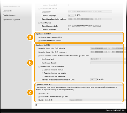 2 | Configure las opciones de DNS IPv4. ![]() [Opciones de DHCP][Obtener nombre de host] Seleccione la casilla de verificación para habilitar la Opción 12 y obtener el nombre de host del servidor DHCP. [Actualización dinámica de DNS] Seleccione la casilla de verificación para habilitar la Opción 81 y actualizar dinámicamente los registros DNS a través del servidor DHCP. [Obtener direc. servidor DNS] Seleccione la casilla de verificación para habilitar la Opción 6 y obtener una dirección de servidor DNS desde el servidor de DHCP. [Obtener nombre de dominio] Seleccione la casilla de verificación para habilitar la Opción 15 y obtener un nombre de dominio desde el servidor de DHCP. [Obtener direc. servidor WINS] Seleccione la casilla de verificación para habilitar la Opción 44 y obtener una dirección de servidor WINS desde el servidor de DHCP. [Obtener direc. servidor POP] Seleccione la casilla de verificación para habilitar la Opción 70 y obtener una dirección de servidor POP3 desde el servidor de DHCP. [Opciones de DNS][Dirección de servidor DNS primario] Introduzca la dirección IP de un servidor DNS. [Dirección de servidor DNS secundario] Introduzca la dirección IP de un servidor DNS secundario, si existe. [Nombre de host] Introduzca caracteres alfanuméricos en el nombre de host del equipo que vaya a registrar en el servidor DNS. [Nombre de dominio] Introduzca caracteres alfanuméricos en el nombre del dominio al que pertenezca el equipo, como "ejemplo.com". [Actualización dinámica de DNS] Seleccione la casilla de verificación para actualizar dinámicamente los registros DNS cuando cambie la dirección IP del equipo. Cuando especifique el intervalo entre las actualizaciones, introduzca el tiempo en horas en el cuadro de texto [Intervalo de actualización dinámica de DNS]. [Opciones de mDNS][Usar mDNS] Adoptado por Bonjour, mDNS (DNS multidifusión) es un protocolo para relacionar un nombre de host con una dirección IP sin utilizar DNS. Seleccione la casilla de verificación para activar mDNS e introduzca el nombre de mDNS en el cuadro de texto [Nombre de mDNS]. |