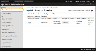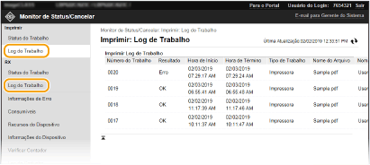 Faça o logon na Interface Remota (Iniciando a Interface Remota [Monitor de Status/Cancelar]  [Status do Trabalho] em [Imprimir]