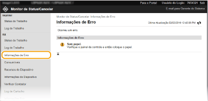 Quando ocorre um erro, está página será exibida quando você clicar na mensagem exibida sob [Informações de Erro] na página Portal (página principal). Tela da Interface Remota