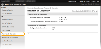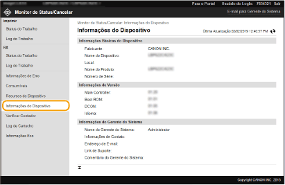 Informações sobre a máquina e o administrador sistema são exibidas. O nome do dispositivo e outras informações de gerente de sistema exibidas aqui correspondem às configurações em [Informações do Gerente do Sistema] na página [Gerenciamento de Usuários] ou em [Configurações de Informações do Dispositivo] na página [Gerenciamento de Dispositivo].