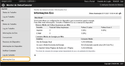 O volume total mensal de impressões e o consumo de energia total mensal são exibidos. Você pode exibir a tela de Informações Eco e alterar as configurações para economizar papel e consumo de energia.