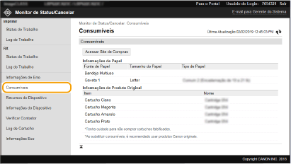 O tamanho do papel e tipo de papel da fonte de papel, número de modelo de cartucho de toner, etc., são exibidos. Também é possível clicar em [Verificar Detalhes de Consumíveis] na página do Portal (página principal) para exibir esta página (Tela da Interface Remota).