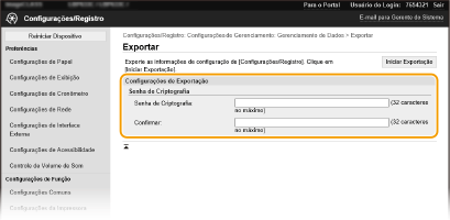Digite uma senha para criptografar os dados de exportação usando os caracteres alfanuméricos. Digite a mesma senha em [Confirmar]. Para exportar os dados, é preciso definir uma senha de criptografia.