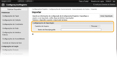 Os dados de configuração da máquina podem ser salvos em seu computador (exportar). Os dados salvos em seu computador também podem ser registrados na máquina (importar). Os dados exportados desta máquina podem ser importados em outra máquina do mesmo modelo. Assim, você pode copiar facilmente diversos dados de configuração em diversas máquinas. Para usar estes recursos, é preciso que você tenha feito login no modo Administrador do Sistema. |