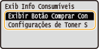 <Exibir Botão Comprar Consumíveis (RUI)> <Desativado> <Ativado> ![]() <Configurações de Toner Status> <Desativado> <Ativado> ![]() <Exibir Botão Comprar Consum.> <Desativado> <Ativado> ![]() |