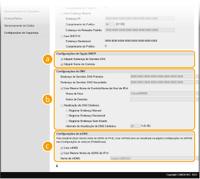 2 | Configure as definições de DNS do IPv4. ![]() [Configurações de Opção DHCP][Adquirir Nome de Host] Marque a caixa de seleção para ativar a Opção 12 para obter o nome de host do servidor DHCP. [Atualização de DNS Dinâmico] Marque a caixa de seleção para ativar a Opção 81 para atualizar dinamicamente os registros DNS através do servidor DHCP. [Adquirir Endereço do Servidor DNS] Marque a caixa de seleção para ativar a Opção 6 para obter um endereço de servidor DNS do servidor DHCP. [Adquirir Nome de Domínio] Marque a caixa de seleção para ativar a Opção 15 para obter um nome de domínio do servidor DHCP. [Adquirir Endereço do Servidor WINS] Marque a caixa de seleção para ativar a Opção 44 para obter um endereço de servidor WINS do servidor DHCP. [Adquirir Endereço do Servidor POP] Marque a caixa de seleção para ativar a Opção 70 para obter um endereço de servidor POP3 do servidor DHCP. [Configurações de DNS][Endereço do Servidor DNS Primário] Digite o endereço IP de um servidor DNS. [Endereço do Servidor DNS Secundário] Digite o endereço IP de um servidor DNS, se houver algum. [Nome de Host] Digite os caracteres alfanuméricos para o nome do host da máquina que será registrada no servidor DNS. [Nome de Domínio] Digite os caracteres alfanuméricos para o nome do domínio pertencente à máquina, como "exemplo.com". [Atualização de DNS Dinâmico] Marque a caixa de seleção para atualizar dinamicamente os registros de DNS se o endereço IP da máquina for alterado. Ao especificar o intervalo entre as atualizações, insira o tempo em horas na caixa de texto [Intervalo de Atualização de DNS Dinâmico]. [Configurações de mDNS][Usar mDNS] Adotado pelo Bonjour, o mDNS (DNS multicast) é um protocolo para associar um nome de host com um endereço IP sem usar o DNS. Marque a caixa de seleção para ativar o mDNS e digite o nome mDNS na caixa de texto [Nome de mDNS]. |