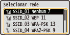 Definições de segurançaSe a conexão sem fio for configurada selecionando um roteador sem fio, o método de autenticação WEP é definido para <Abrir Sistema> ou o método de criptografia WPA/WPA2 é definido para <Automático>(AES-CCMP ou TKIP). Se você deseja selecionar <Chave Compartilhada> para a autenticação WEP ou <AES-CCMP> para a criptografia WPA/WPA2, você precisa configurar a conexão usando <Inserir nome da rede man.>. Configurando a conexão especificando definições detalhadas |
