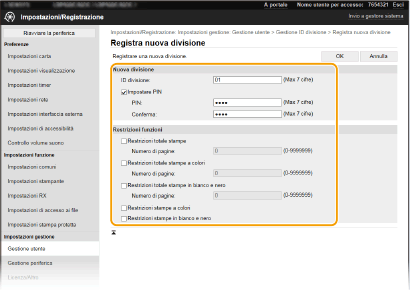 2 | Specificare le impostazioni richieste. [ID divisione] Digitare il numero di ID reparto da registrare. [Impostare PIN] Per impostare un PIN, selezionare la casella di controllo e immettere lo stesso numero sia nella casella [PIN] che [Conferma]. [Restrizioni funzioni] È possibile limitare il numero di pagine da stampare e le funzioni disponibili per i reparti da registrare. Per limitare il numero di pagine da stampare, selezionare la casella di controllo per la tipologia target e digitare il numero corretto di pagine in [Numero di pagine]. Selezionare la casella di controllo per le funzioni di interesse per limitarle. |