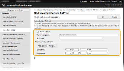 Consente di controllare i valori inseriti nelle impostazioni di AirPrint, come il nome e la posizione della macchina. Per modificare le impostazioni, fare clic su [Modifica].