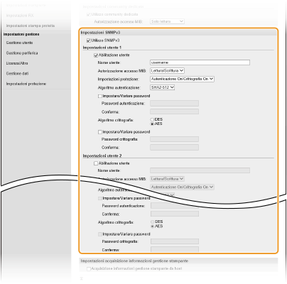 Il Protocollo Simple Network Management (SNMP) è un protocollo per il monitoraggio e il controllo dei dispositivi di comunicazione in una rete tramite Management Information Base (MIB). La macchina supporta SNMPv1 e SNMPv3 con sicurezza potenziata. È possibile verificare lo stato della macchina da un computer quando si stampano documenti o si utilizza la IU remota. È possibile abilitare SNMPv1 o SNMPv3 o entrambi contemporaneamente. Specificare le impostazioni per ogni versione, in modo da adeguarsi all'ambiente di rete e allo scopo di utilizzo.