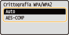 2 | Selezionare un metodo di crittografia. <Auto> Imposta la macchina per selezionare automaticamente AES-CCMP o TKIP in modo che corrisponda all'impostazione del router wireless. <AES-CCMP> Imposta AES-CCMP come metodo di crittografia. |