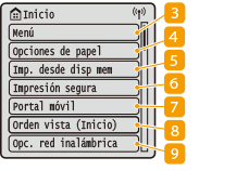 ![]() | <Menú><Opciones de funciones>, <Preferencias>, y muchas otras configuraciones del equipo se inician desde este botón. Lista del menú de configuración <Opciones de papel>Este botón se utiliza para especificar el tamaño y el tipo de papel cargado en el casete y en la ranura de alimentación manual. Especificación del tamaño y tipo de papel <Imp. desde disp mem>Imprime archivos almacenados en un dispositivo de memoria USB. Impresión desde memoria USB (Impresión desde dispositivo de memoria) <Impresión segura>Utilice esta función para imprimir un documento protegido . Impresión de un documento con protección por PIN (Impresión segura) <Portal móvil>Utilícelo para establecer una conexión con un dispositivo móvil. Conectar con dispositivos móviles <Orden vista (Inicio)>Permite cambiar el orden en el que se muestran los botones de la pantalla Inicio. Personalización de la pantalla Inicio <Opc. red inalámbrica>Use este botón para configurar las opciones de LAN inalámbrica. Conexión a una LAN inalámbrica |