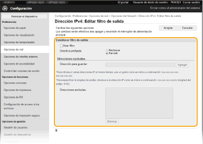 Cuando se selecciona [Rechazar] para un filtro de salida
