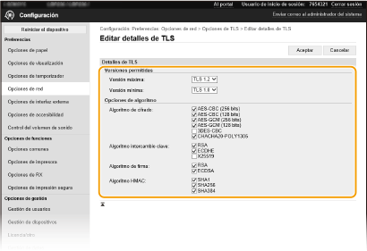 Especifique la [Versión máxima] y la [Versión mínima] de TLS.