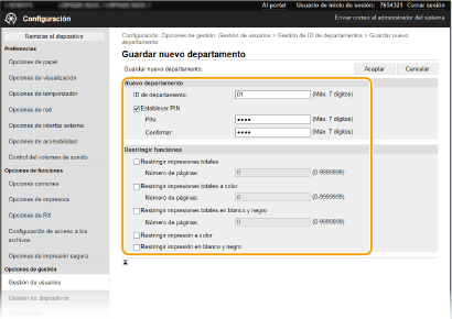 Registre un ID de departamento y establezca un PIN para ese ID. Registre todos los ID de departamento que haya que administrar.