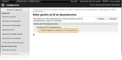 Para obtener información sobre [Permitir trabajos de impresión con ID desconocido], consulte Bloqueo de trabajos cuando el ID de departamento es desconocido.