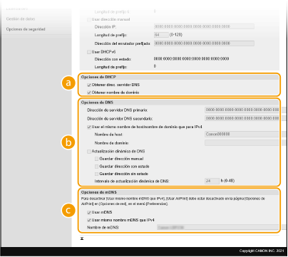 2 | Configure las opciones de DNS IPv4. ![]() [Opciones de DHCP][Obtener nombre de host] Seleccione la casilla de verificación para habilitar la Opción 12 y obtener el nombre de host del servidor DHCP. [Actualización dinámica de DNS] Seleccione la casilla de verificación para habilitar la Opción 81 y actualizar dinámicamente los registros DNS a través del servidor DHCP. [Obtener direc. servidor DNS] Seleccione la casilla de verificación para habilitar la Opción 6 y obtener una dirección de servidor DNS desde el servidor de DHCP. [Obtener nombre de dominio] Seleccione la casilla de verificación para habilitar la Opción 15 y obtener un nombre de dominio desde el servidor de DHCP. [Obtener direc. servidor WINS] Seleccione la casilla de verificación para habilitar la Opción 44 y obtener una dirección de servidor WINS desde el servidor de DHCP. [Obtener direc. servidor POP] Seleccione la casilla de verificación para habilitar la Opción 70 y obtener una dirección de servidor POP3 desde el servidor de DHCP. [Opciones de DNS][Dirección de servidor DNS primario] Introduzca la dirección IP de un servidor DNS. [Dirección de servidor DNS secundario] Introduzca la dirección IP de un servidor DNS secundario, si existe. [Nombre de host] Introduzca caracteres alfanuméricos en el nombre de host del equipo que vaya a registrar en el servidor DNS. [Nombre de dominio] Introduzca caracteres alfanuméricos en el nombre del dominio al que pertenezca el equipo, como "ejemplo.com". [Actualización dinámica de DNS] Seleccione la casilla de verificación para actualizar dinámicamente los registros DNS cuando cambie la dirección IP del equipo. Cuando especifique el intervalo entre las actualizaciones, introduzca el tiempo en horas en el cuadro de texto [Intervalo de actualización dinámica de DNS]. [Opciones de mDNS][Usar mDNS] Adoptado por Bonjour, mDNS (DNS multidifusión) es un protocolo para relacionar un nombre de host con una dirección IP sin utilizar DNS. Seleccione la casilla de verificación para activar mDNS e introduzca el nombre de mDNS en el cuadro de texto [Nombre de mDNS]. |