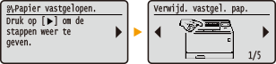 In sommige gevallen worden, wanneer er een fout optreedt, instructies weergegeven over hoe u moet reageren. Volg de aanwijzingen op het scherm voor het oplossen van het probleem. Het scherm dat wordt weergegeven wanneer er zich een papierstoring voordoet, wordt hieronder getoond als voorbeeld.