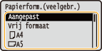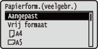 Als u het formaat van het te laden papier vaak moet veranderen, selecteert u <Vrij>. Dit vermindert het aantal stappen dat iedere keer moet worden verricht om de instellingen te veranderen. Let op: bij deze instelling zal het apparaat afdrukken, ook als in het printerstuurprogramma een ander type papier is ingesteld dan er daadwerkelijk in het apparaat is geladen.