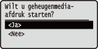 Als <Scherm geheugenmedia aangesloten> is ingesteld op <Aan>, verschijnt het scherm over de vraag of Afdrukken uit het geheugen moet plaatsvinden als u een USB-geheugenapparaat plaatst terwijl het scherm Start wordt weergegeven. <Scherm geheugenmedia aangesloten> ![]() Schermen worden misschien niet weergegeven in de slaapstand, daarom moet u de slaapstand verlaten voordat u een USB-geheugenapparaat plaatst. |