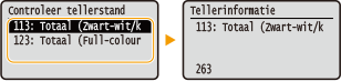 U kunt afzonderlijke totalen opvragen voor het aantal kleurenpagina's dat is afgedrukt en het aantal pagina's in zwart-wit. Het aantal afdrukken omvat afdrukken uit geheugenmedia en de lijst, maar ook afdrukken van gegevens vanaf computers.