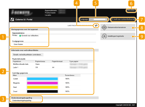 Als u inlogt op de externe UI, verschijnt de volgende portalpagina. Dit gedeelte beschrijft de items die op de portalpagina worden weergegeven en de basisbewerkingen.