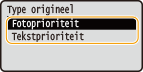 <Type origineel> U kunt het type van het origineel selecteren, afhankelijk van de afbeelding die u gaat afdrukken. <Fotoprioriteit> Kies deze optie om prioriteit te geven aan het mooi afdrukken van foto's. <Tekstprioriteit> Kies deze optie om prioriteit te geven aan het scherp afdrukken van tekst. |