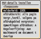 <Opmerkingen afdrukken> Met deze instelling kunt u opgeven of aantekeningen in het PDF-bestand moeten worden afgedrukt. <Uit> Geen aantekeningen afdrukken. <Automatisch> Drukt alleen deze aantekeningen af die volgens opgaaf in het PDF-bestand moeten worden afgedrukt. |