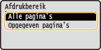 <Afdrukbereik> Geef de pagina's op die u wilt afdrukken. <Alle pagina's> Drukt alle pagina's af. <Opgegeven pagina's> Geef het paginabereik op dat u wilt afdrukken. Voer in <Eerste pagina> en <Laatste pagina> de betreffende paginanummers in met behulp van de numerieke toetsen, en selecteer <Toepassen>. Als het opgegeven paginabereik niet overeenkomt met de pagina´s van het PDF-bestand, wordt er niets afgedrukt. |