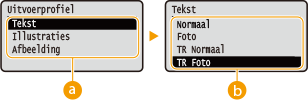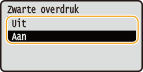 Configureert een instelling zodanig dat zwarte tekst waarvan de kleurinformatie "R=G=B=0%", "C=M=Y=100%", of "C=M=Y=0% / K=100%" wordt afgedrukt met uitsluitend K (zwart) toner. Als <Uit> is geselecteerd, wordt tekst afgedrukt op basis van de instelling <Uitvoerprofiel>.