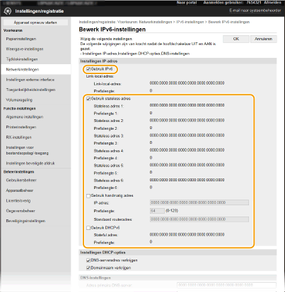![]() | De IPv6-adressen van het apparaat kunnen worden geconfigureerd via de externe UI. Voordat u IPv6-adressen instelt, moet u de instellingen voor het IPv4-adres controleren (IPv4-instellingen weergeven). U moet de juiste IPv4-instellingen opgeven om te kunnen werken met IPv6-adressen. Het apparaat kan de onderstaande IPv6-adressen gebruiken: |