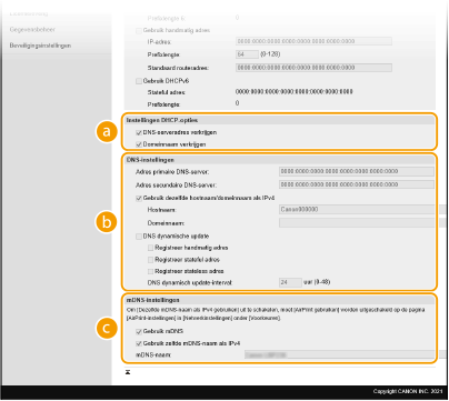 2 | Configureer de DNS-instellingen van IPv4. ![]() [Instellingen DHCP-opties][Hostnaam verkrijgen] Schakel dit selectievakje in om Optie 12 in te schakelen en de hostnaam te verkrijgen van de DHCP-server. [DNS dynamische update] Schakel dit selectievakje in om Optie 81 in te schakelen en de DNS-records dynamisch bij te werken via de DHCP-server. [DNS-serveradres verkrijgen] Schakel dit selectievakje in als u Optie 6 wilt inschakelen en een DNS-server wilt ophalen van de DHCP-server. [Domeinnaam verkrijgen] Schakel dit selectievakje in als u Optie 15 wilt inschakelen en de domeinnaam wilt ophalen van de DHCP-server. [WINS-serveradres verkrijgen] Schakel dit selectievakje in als u Optie 44 wilt inschakelen en een WINS-serveradres wilt ophalen van de DHCP-server. [POP-serveradres verkrijgen] Schakel dit selectievakje in als u Optie 70 wilt inschakelen en een POP3-serveradres wilt ophalen van de DHCP-server. [DNS-instellingen][Adres primaire DNS-server] Voer het IP-adres van een DNS-server in. [Adres secundaire DNS-server] Voer het IP-adres van een secundaire DNS-server in, indien beschikbaar. [Hostnaam] Typ hier alfanumerieke tekens voor de hostnaam van het apparaat dat u wilt registreren op de DNS-server. [Domeinnaam] Typ hier alfanumerieke tekens voor de naam van het domein waarvan de machine deel uitmaakt, zoals 'voorbeeld.com'. [DNS dynamische update] Schakel dit selectievakje in als u de DNS-records dynamisch wilt bijwerken wanneer het IP-adres van het apparaat verandert. Wanneer u een interval wilt instellen tussen updates, voert u de tijd in uren in het vak [DNS dynamisch update-interval] in. [mDNS-instellingen][Gebruik mDNS] mDNS (multicast DNS) wordt ondersteund door Bonjour en is een protocol voor het koppelen van een hostnaam aan een IP-adres zonder DNS te gebruiken. Schakel dit selectievakje in om mDNS in te schakelen en voer de mDNS-naam in het vak [mDNS-naam] in. |