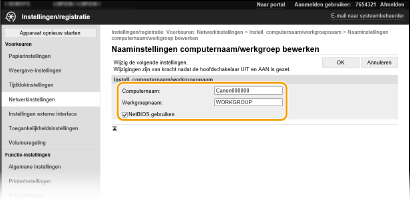 Een werkgroepnaam is een naam om meerdere computers te groeperen, zodat deze in een Windows-netwerk de beschikking krijgen over eenvoudige netwerkfuncties, zoals bestandsdeling. Gebruik alfanumerieke tekens bij het opgeven van de naam van de werkgroep waarvan het apparaat deel uitmaakt.