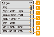 ![]() | <Meny><Funksjonsinnstillinger>, <Preferanser> og mange andre maskininnstillinger har utgangspunkt fra denne knappen. Innstillingsmenyliste <Papirinnstillinger>Denne knappen brukes til å angi format og type for papiret som er lagt inn i papirskuffen og åpningen for manuell mating. Spesifisere papirformat og -type <Minnemedieutskrift>Skriver ut filer lagret på en USB-minneenhet. Skrive ut fra en USB-minneenhet (utskrift fra minnemedia) <Sikker utskrift>Bruk denne funksjonen til å skrive ut et sikret dokument. Skrive ut et dokument som er sikret med en PIN-kode (konfidensiell utskrift) <Mobil portal>Bruk dette for å opprette en direkte trådløs tilkobling til en mobilenhet. Koble til med mobile enheter <Vis rekkef. (Hjem)>Lar deg endre rekkefølgen som knappene på Hjem-skjermen vises i. Tilpasse Hjem-skjermen <Trådløst LAN-sett.>Bruk denne knappen for innstillinger for trådløst LAN. Koble til trådløst LAN |