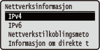 Viser nettverksinnstillingene, for eksempel maskinens IP-adresse, og status, for eksempel tilstanden til trådløs LAN-kommunikasjon.