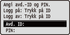 Hvis administrasjon med avdelings-ID eller systemstyrer-ID er aktivert, må du logge inn før du kan bruke maskinen. Når innloggingsskjermen vises, følg fremgangsmåten nedenfor for å taste inn avdelings-ID og PIN-kode.