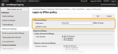 Hvis [IPv4 manuelle innstillinger] eller [IPv6 manuelle innstillinger] er valgt for [Ekstern adresse], angir du IP-adressen for å aktivere policyen. Du kan også angi et område med adresser ved å sette inn en bindestrek mellom adressene.