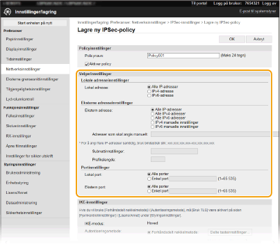 [IPv6-adresse] | Velg om du vil bruke IPSec for alle IP-pakker som sendes til eller fra en IPv6-adresse til maskinen. |