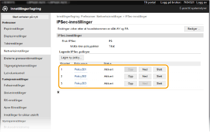 Policyer brukes fra den øverste policyen til den nederste. Klikk på [Opp] eller [Ned] for å flytte en policy opp eller ned i rekkefølgen.