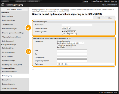 Ettersom sertifikater som genereres på maskinen ikke har en CA-signatur, kan en kommunikasjonsfeil oppstå avhengig av enhetene den kommuniserer med. For at sertifiseringsinstansen skal tildele sertifikatet med CA-signatur, må du innhente data for CSR (forespørsel om sertifikatsignering), som administratoren kan generere fra Fjernkontroll. Når sertifikatet er tildelt, registrerer du det i nøkkelen med det CSR-genererte sertifikatet.