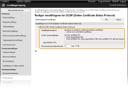 Du kan verifisere om sertifikater som er mottatt fra en annen part under kommunikasjon er gyldig, ved å sende en spørring til OCSP (online certificate status protocol)-responderen (en server som støtter OCSP). Konfigurer sertifikatets verifiseringnivå og OCSP-responderen det skal kobles til. Disse må registreres av administratoren.
