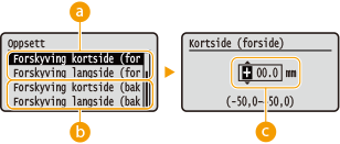 <Tetthet> <Gul>/<Magenta>/<Cyan>/<Svart> 17 nivåer <Tetthet (finjuster)> <Gul>/<Magenta>/<Cyan>/<Svart> <Høy>/<Middels>/<Lav> 17 nivåer |