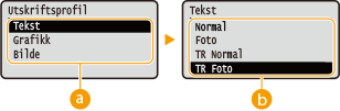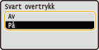 Konfigurerer en innstilling slik at svart tekst som fargeinformasjonen for, er "R = G = B = 0%," "C = M = Y = 100%," eller "C = M = Y = 0%/K = 100%", skrives ut med kun K (svart) toner. Når du velger <Av>, skrives teksten ifølge innstillingen for <Utskriftsprofil>.