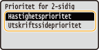 Stjerner (*)Det kan hende at innstillinger merket med "*1" ikke vises, alt etter hvilken modell du bruker, alternativer eller andre innstillingselementer. Innstillinger merket med "*2" kan ikke importeres eller eksporteres. Prioritet for innstillingerHvis en utskriftsinnstilling er angitt fra både skriverdriveren og maskinens betjeningspanel, overstyrer spesifikasjonen fra skriverdriveren den fra betjeningspanelet. Spesifikasjonen fra betjeningspanelet gjelder i noen spesifikke tilfeller, som for eksempel ved PS-/PCL-utskrift og når du skriver ut fra en datamaskin som kjører UNIX eller et annet operativsystem som ikke har tilgjengelige skriverdrivere for maskinen. |