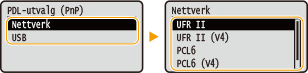 Velg et sidebeskrivelsesspråk, slik at maskinen registreres som en skriver som er kompatibel med dette språket, når den kobles til en datamaskin via USB.