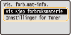 <Vis Kjøp forbruksmateriell-knappen (RUI)> <Av> <På>  <Innstillinger for Toner Status> <Av> <På>  <Vis Kj. forb.mat.-knapp> <Av> <På>  |