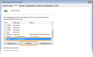 1 | Velg porten som skal slettes og klikk på [Slett port]. ![]() ![]() Du kan ikke slette en port mens den er konfigurert som utskriftsport. Hvis du vil slette denne porten, må du velge en annen port og så klikke på [Bruk] slik at den er konfigurert som den nye utskriftsporten. Deretter kan du slette den opprinnelige porten. |