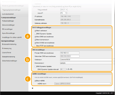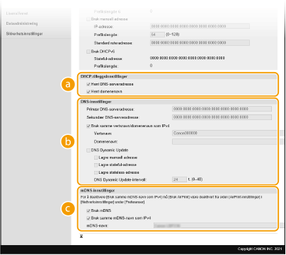 2 | Konfigurer IPv4 DNS-innstillinger. ![]() [DHCP-tilleggsinnstillinger][Hent vertsnavn] Merk av i boksen for å la alternativ 12 hente vertsnavnet fra DHCP-serveren. [DNS Dynamic Update] Merk av i boksen for å la alternativ 81 oppdatere DNS-postene dynamisk via DHCP-serveren. [Hent DNS-serveradresse] Merk av i boksen for å la alternativ 6 hente en DNS-serveradresse fra DHCP-serveren. [Hent domenenavn] Merk av i boksen for å la alternativ 15 hente et domenenavn fra DHCP-serveren. [Hent WINS-serveradresse] Merk av i boksen for å la alternativ 44 hente en WINS-serveradresse fra DHCP-serveren. [Hent POP-serveradresse] Merk av i boksen for å la alternativ 70 hente en POP3-serveradresse fra DHCP-serveren. [DNS-innstillinger][Primær DNS-serveradresse] Angi IP-adressen for en DNS-server. [Sekundær DNS-serveradresse] Angi IP-adressen for en sekundær DNS-server, hvis aktuelt. [Vertsnavn] Angi alfanumeriske tegn for vertsnavnet for maskinen som skal registreres på DNS-serveren. [Domenenavn] Angi alfanumeriske tegn for navnet på domenet der maskinen hører til, for eksempel "example.com". [DNS Dynamic Update] Merk av i boksen for en dynamisk oppdatering av DNS-postene når maskinens IP-adresse endres. Når du skal angi intervallet mellom oppdateringer, angir du tiden i timer i tekstboksen [DNS Dynamic Update-intervall]. [mDNS-innstillinger][Bruk mDNS] mDNS (multikast-DNS) brukes av Bonjour og er en protokoll for å knytte et vertsnavn til en IP-adresse uten bruk av DNS. Merk av i boksen hvis du vil aktivere mDNS, og angi mDNS-navnet i tekstboksen [mDNS-navn]. |